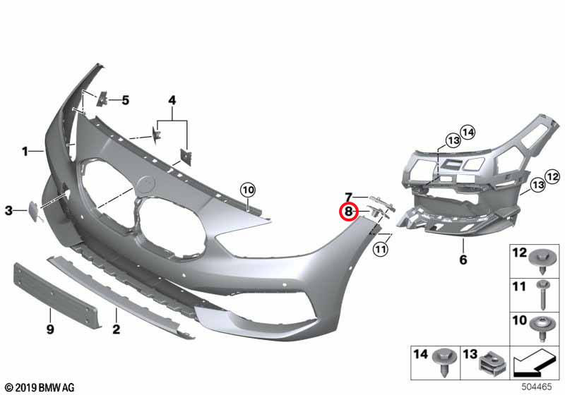 Also referred to in the BMW parts catalogue as “Bumper guide right bottom”, this component is fitted to the lower right section of the front bumper assembly. It ensures correct bumper alignment and secure positioning, helping to maintain proper panel gaps and structural stability.