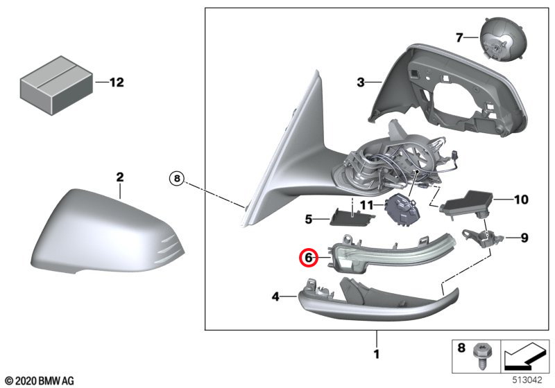 This genuine BMW exterior mirror auxiliary turn indicator (51169879128) is compatible with the BMW 1 Series F40 (2019–2024) and BMW 2 Series Gran Coupé F44 (2019–2024). It is supplied for the right-hand side and applies to vehicles not equipped with Individual Exterior Line (burnished aluminium) and not equipped with High-Gloss Shadow Line. This indicator forms part of the exterior mirror assembly shown in the diagram and is used for the mirror-integrated turn signal function. This item is suitable as a direct replacement for the original auxiliary mirror indicator on applicable vehicles.
