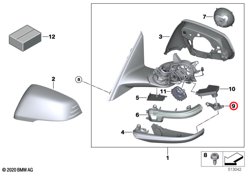 This genuine BMW exterior mirror light module bracket set (51169883907) is compatible with the BMW 1 Series F40 (2019–2024) and BMW 2 Series Gran Coupé F44 (2019–2024) vehicles equipped with the Light Package (S563A). It applies to vehicles not fitted with Individual Exterior Line (burnished aluminium) and not fitted with High-Gloss Shadow Line. Supplied as a set, these brackets form part of the exterior mirror assembly shown in the diagram and are used to support and secure the mirror light module. This item is suitable as a direct replacement for the original light module bracket set on applicable vehicles.