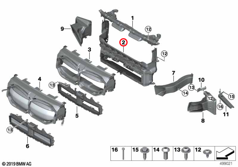 This component is installed within the front bumper assembly and supports the air duct structure, ensuring correct airflow direction towards cooling and aerodynamic channels. It is a genuine BMW part and the correct replacement for maintaining the factory-designed air guidance system and structural alignment within the front bumper.